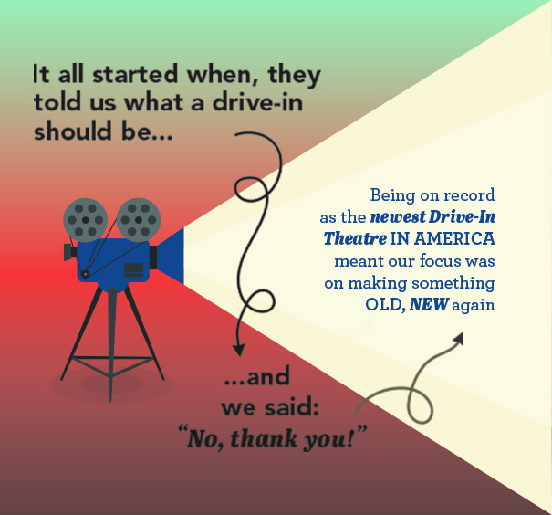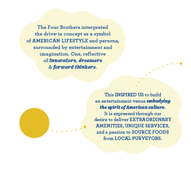 The Four Brothers Group designed the drive-in around the spirit of American imagination, ingenuity, and lifestyle. Our model is based on family, entertainment, and creating beautiful memories. We care about sourcing local foods, providing unique services, great amenities and delivering happiness. We built this for you, for families, daters, friends, and even pets. It is designed by people for people.